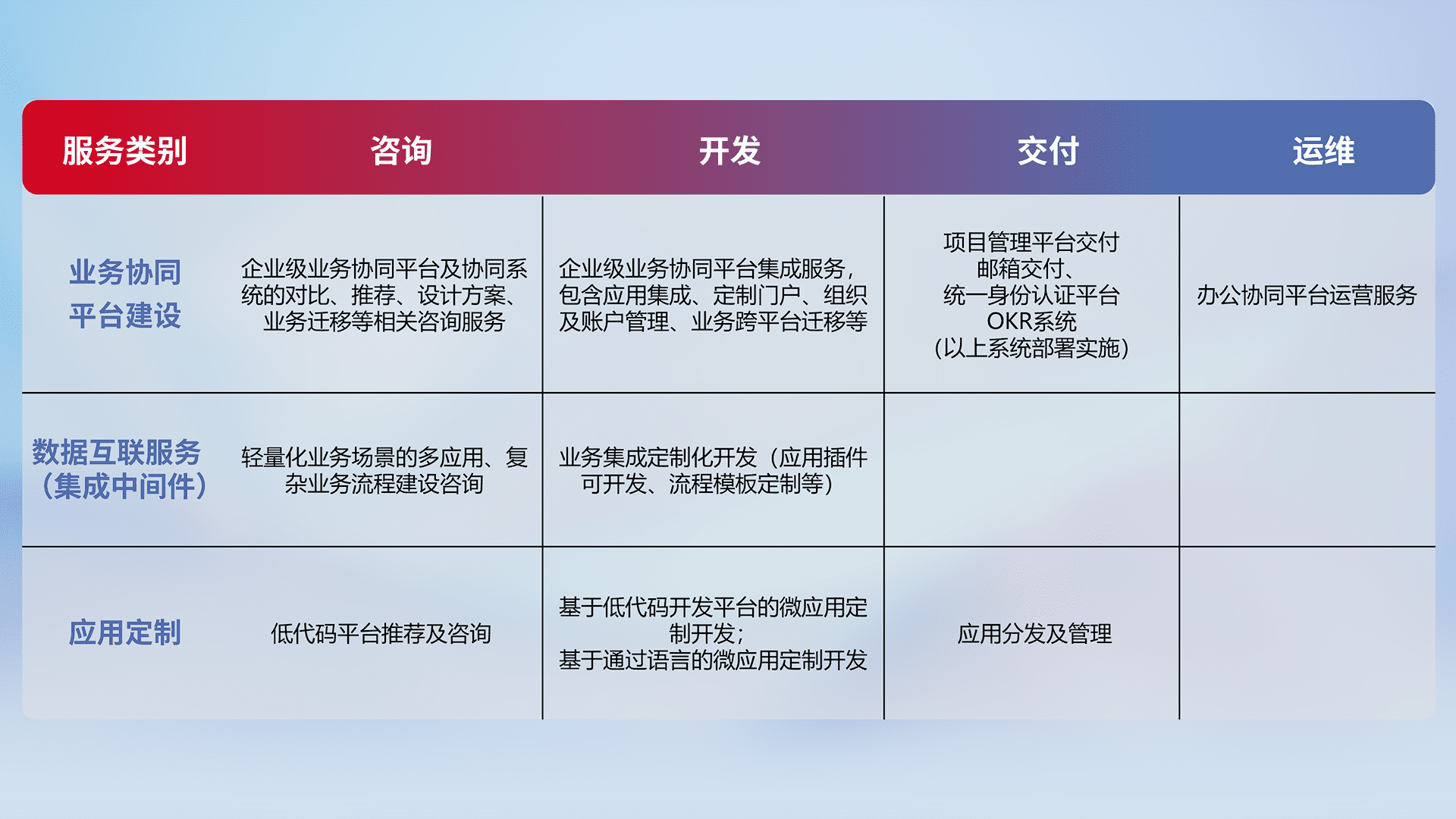 针对钉钉、、企微、、、、IDaas等平台级产品提供产品的规划、、方案、、、交付、、、定制化开发等服务,,,实现如统一协同办公、、智能客户服务、、混合会议管理、、智能数据查询、、、、等业务场景,,实现数字化转型。。。